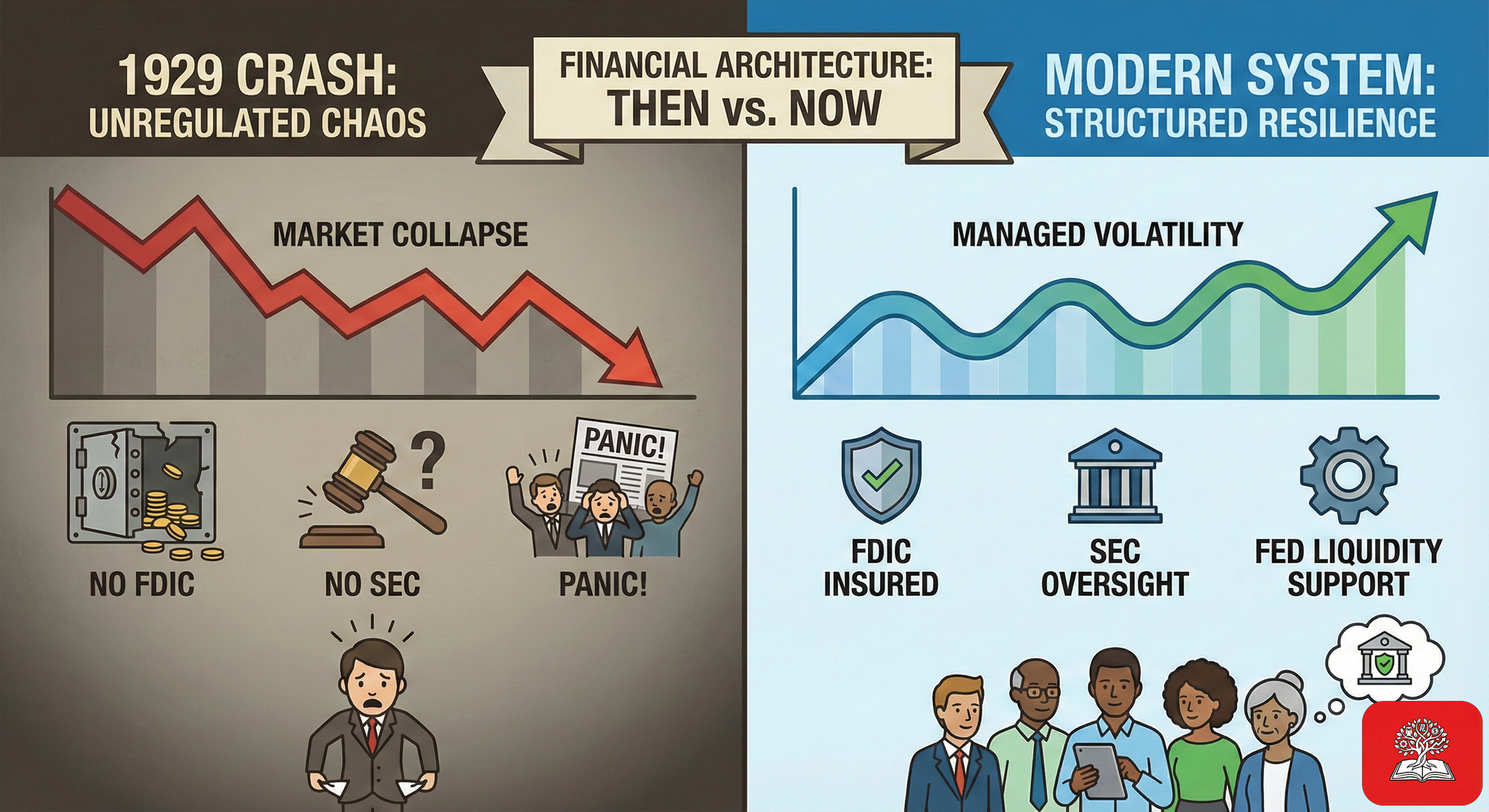However, the "Depression" was a failure of government and banking architecture, not just a failure of stock prices. We have built firewalls—the SEC, the FDIC, the active Fed—that make the burning down of the entire house far less probable. We may lose money in the market, but we are unlikely to lose the economy itself.